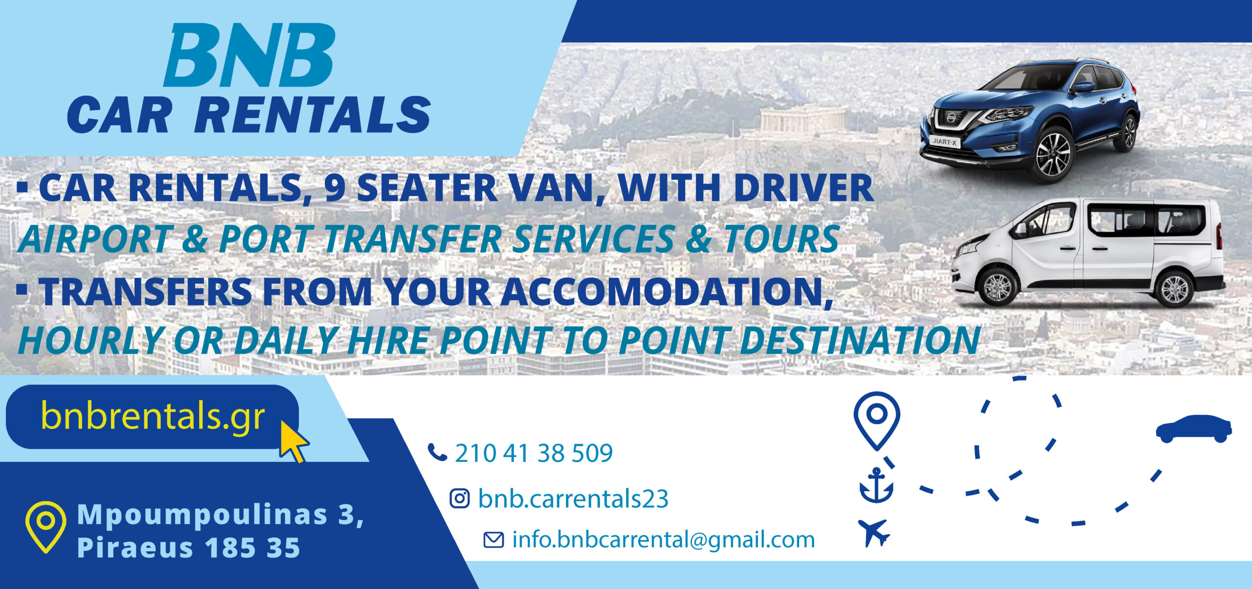 If you are looking a reliable car rental company at the port of Piraeus trust BNB car rental. Because of 30 years of experience we guarantee a safe and low cost rental without hidden costs.